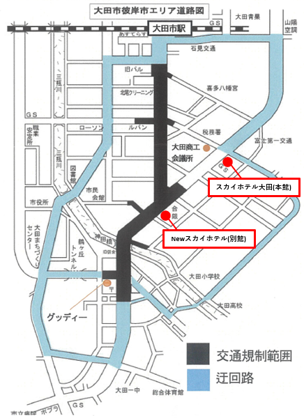 スカイホテル大田(本館)は迂回路にて出入りが可能でございますが、Newスカイホテル(別館)は駅通りの規制区間内に位置しております関係で、時間帯によりましては駐車場からの入出庫ができなくなっております。